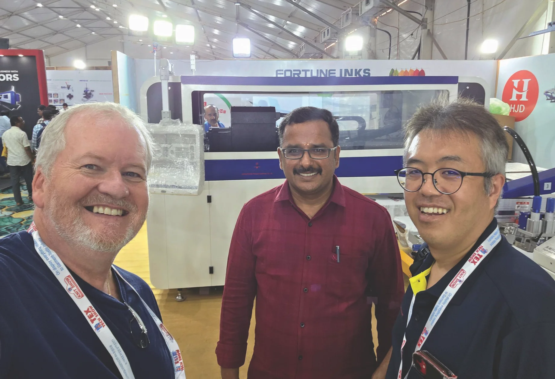 Chinese manufacturer HJD, represented in India by Fortune, also displayed a hybrid system. This configuration featured 28 platens, six screen stations and a CMYK digital-print unit driven by Ricoh Gen5/6 heads. With a quoted output of up to 600 T-shirts/hr, the system carries a higher starting price of around 73 lakhs (€70,000). HJD also offers an eight-colour hybrid option within its portfolio.