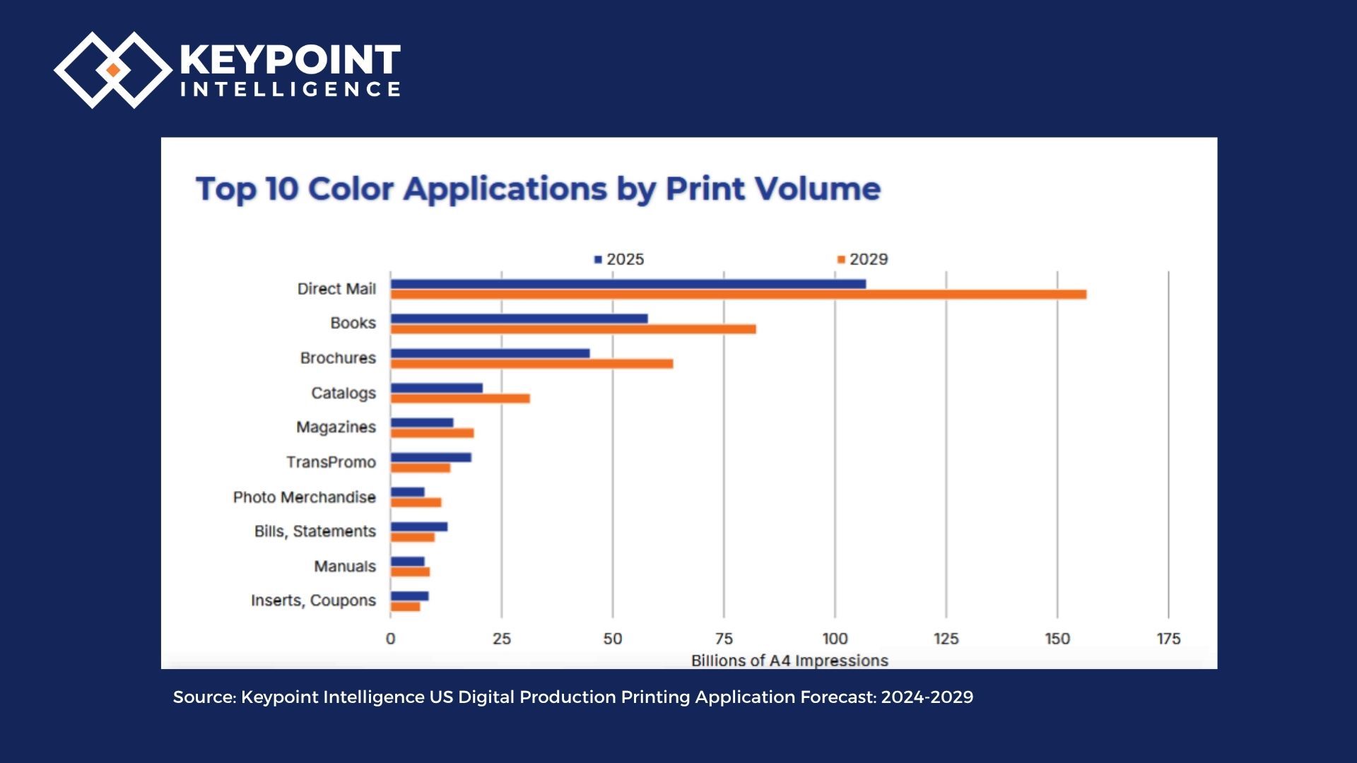 Direct mail continues to dominate digital print volumes, and they are projected to grow steadily over the next several years. Brochures and catalogs are also expanding in the digital printing space, reinforcing that print still is a critical channel within the marketing mix.